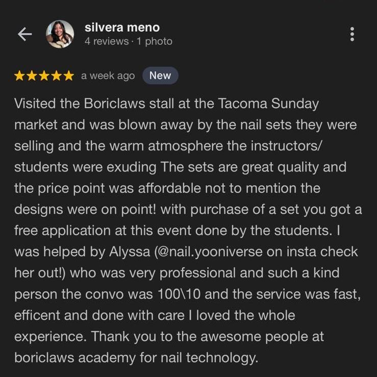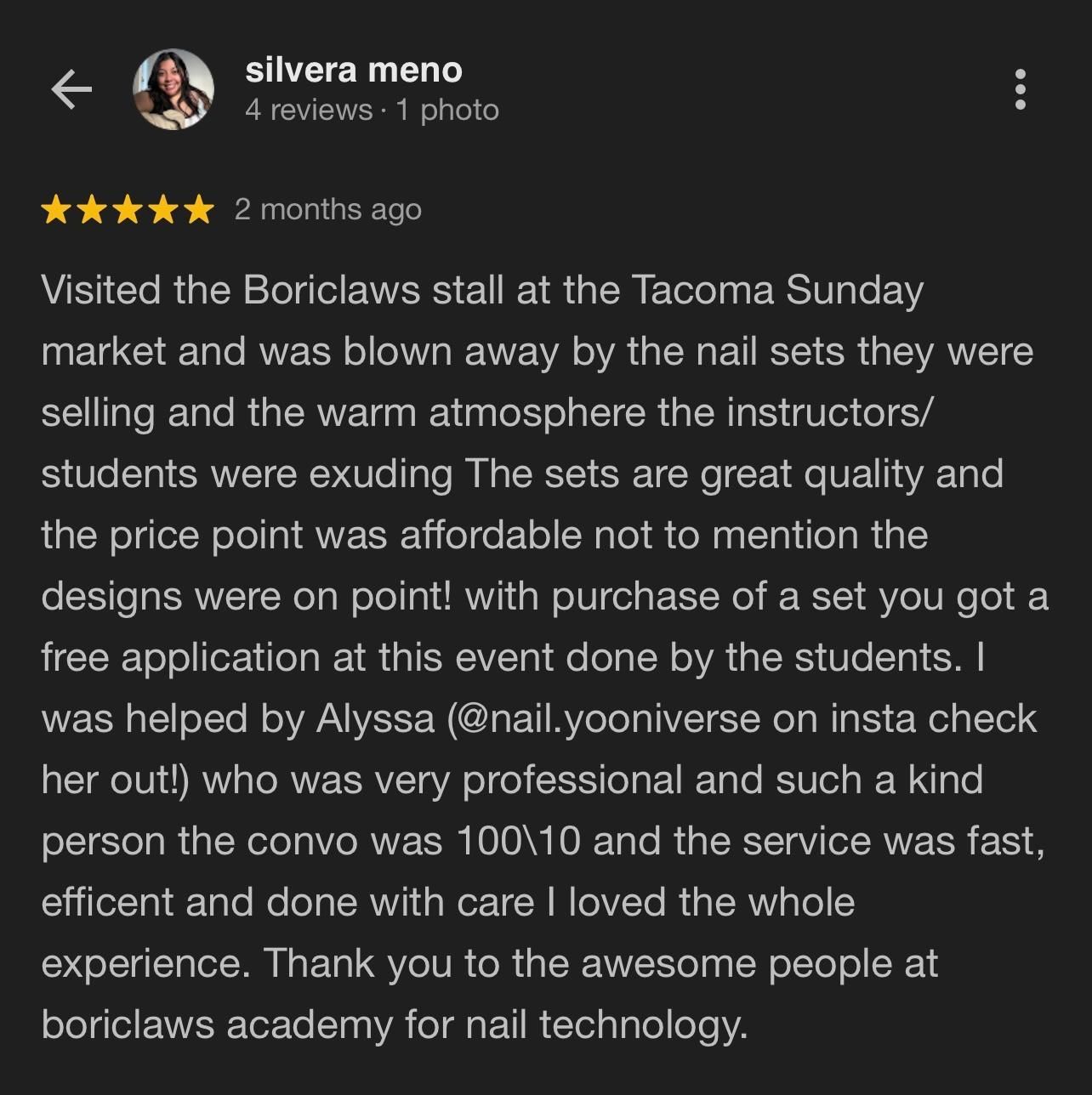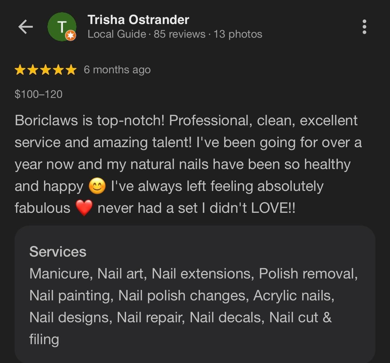 “There are so many things I could say about Boriclaws! She was professional yet made me feel like we've known each other forever. She took my vision and brough tit to life and even got me out of my comfort zone with colors! I already have my next appointment booked! FOUR WEEKS AHEAD. haha”